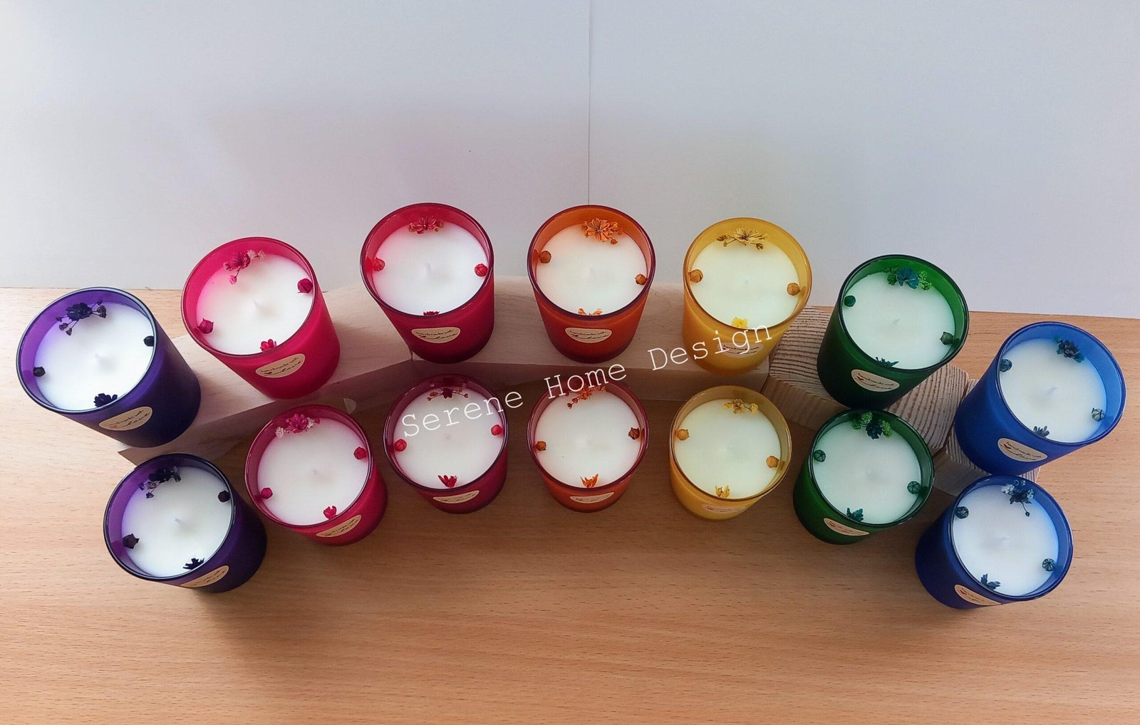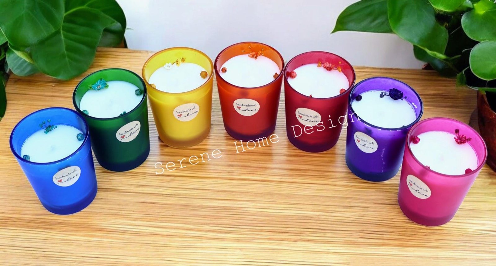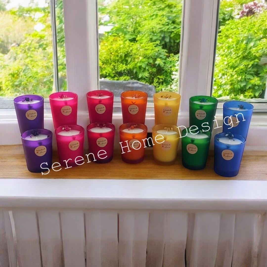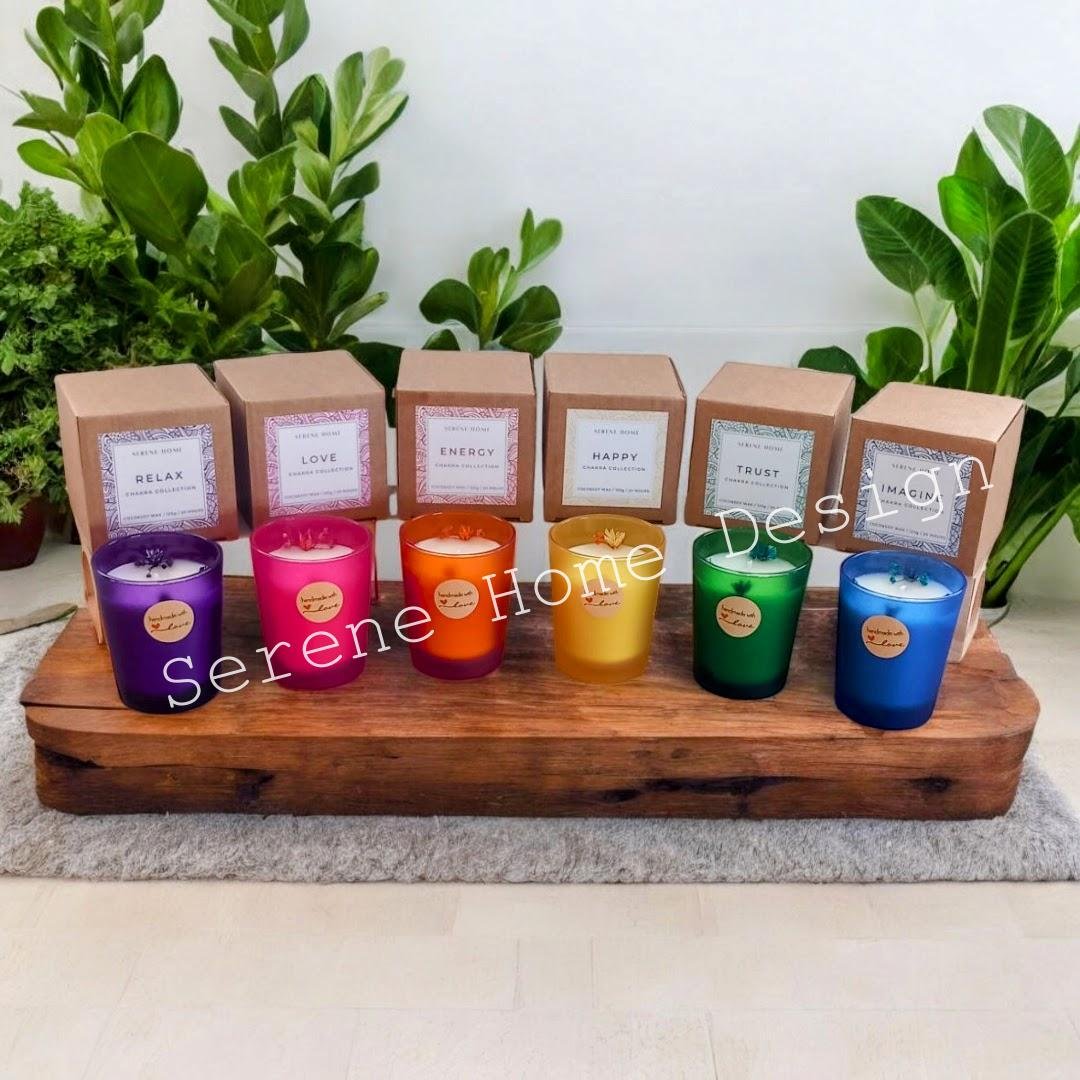 Çakra Mum Koleksiyonumuz, 7 farklı renkte (mor/pembe/kırmızı/turuncu/sarı/yeşil/mavi) buzlu cam bardaklara hazırlanan kokulu doğal mumlardır.